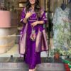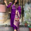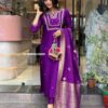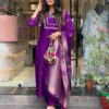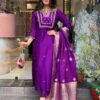 Women’S And Girls Wear Purple Color Roman Silk Embroidered Work A-Line Kurta, Pant and Dupatta Set Size-M